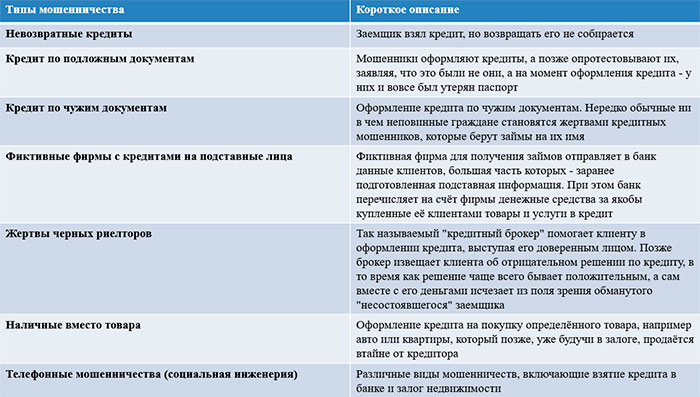 Сергей Парфенов, технический директор компании «Фаззи Лоджик Лабс», объясняет: «В целях получения ответов на эти и другие вопросы в нашей компании довольно давно ведется досье с описанием различных схем банковского мошенничества, сгруппированных по нескольким типам мошенничества». Ниже представлены некоторые из них.